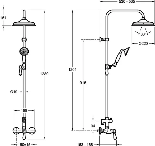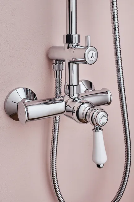 Colonne de douche Louise, le confort moderne allié au charme de l’ancien. Détails soignés en céramique véritable. Cartouche haute précision pour un réglage précis de la tempétaure. Une pomme haute qui assure une bonne couverture d’eau lors de la douche.
